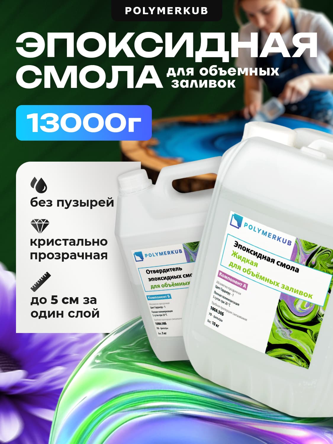 Эпоксидная смола для объемных заливок POLYMERKUB. Это отличный выбор как для новчиков, так и для опытных мастеров. Это прекрасный выбор для заливки столешниц, с возможностью заливки до 4 см. Высокий гляенец, полная самостоятельная дегазация, и оптически прозрачный состав сделает ваше ищделие по настоящему уникальным. Основные сферы применения: Производство столешниц, производство сувенирной продукции, защитные покрытия, наливные полы.